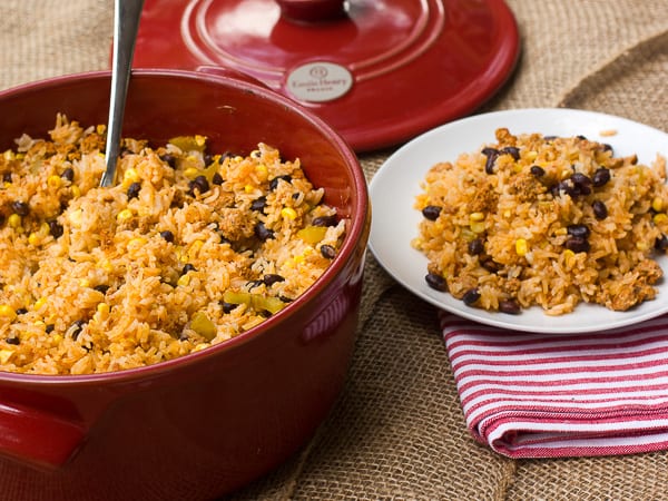 This recipe is a baked rice casserole and there seems to be dishes like this all over the world: southern USA has jambalaya, India makes pilau and paella is a common Spanish dish. The version in this recipe has Mexican inspired flavors with the chorizo, black beans and corn.