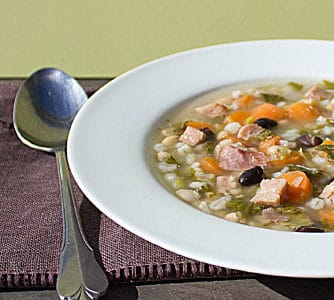 Since Easter is over, I had lot of leftover ham in the fridge. I always make sure that I buy ham with a bone because it makes incredible soup. Ham and beans are a classic combination for soup and this recipe includes barley and split peas to make it extra hearty.