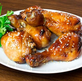 - For Baked Chicken Drumsticks (as seen in the picture). Marinate the legs for 1-2 hours. Bake in a 350F oven for about 40 minutes. Sprinkle with sesame seeds before serving.