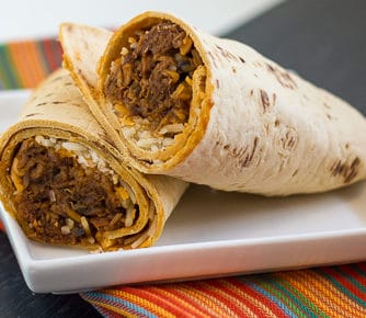 - Scoop a couple heaping spoonfuls of the pork and mushroom mixture on a wrap. Sprinkle a handful of grated cheese on the mixture. Roll the wrap up.