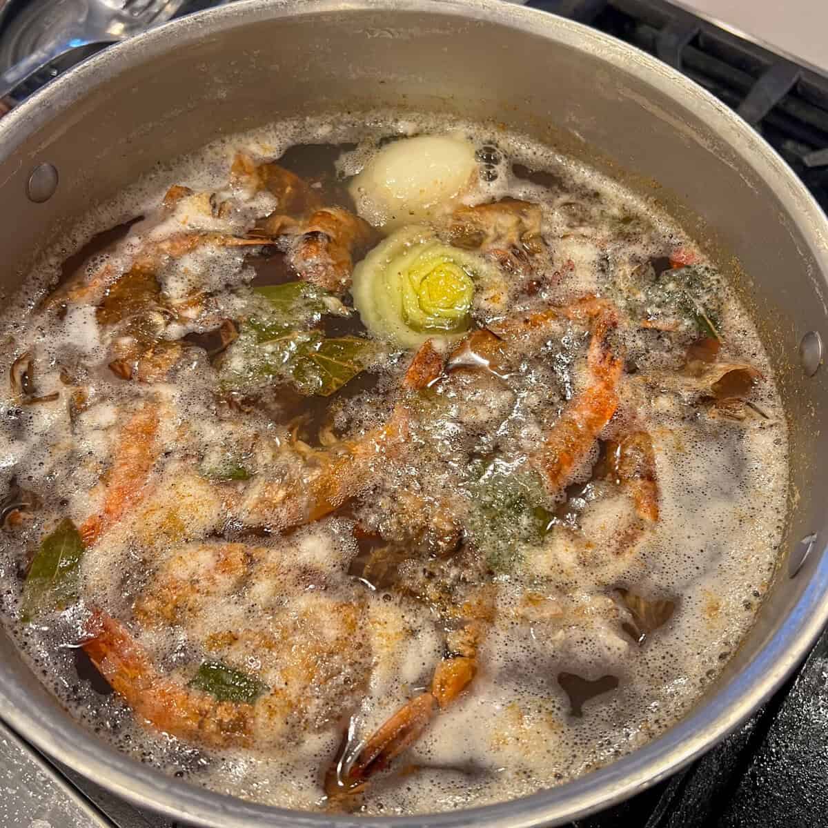 While the roux is simmering, I like to make some seafood stock in another pot. It is very easy to make and cheaper than buying a few cartons of broth.