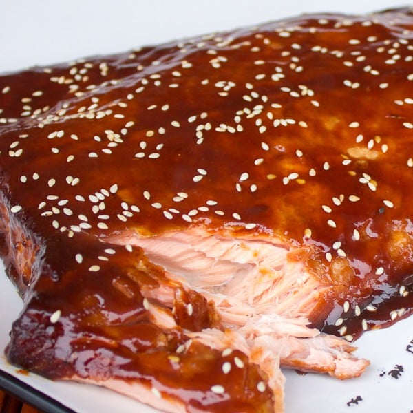 After the salmon is done smoking, brush this glaze all over the fillet and then sprinkle some sesame seeds on top. This salmon is moist, smokey and has a wonderful sweet flavour from the marinade and glaze.