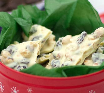 This recipe uses dried cherries and toasted hazelnuts and mixed with melted white chocolate. The white chocolate is mild and allows the dried fruit and nuts to shine. Dried cherries have a taste similar to dried cranberries, but are more sweet and less tart.